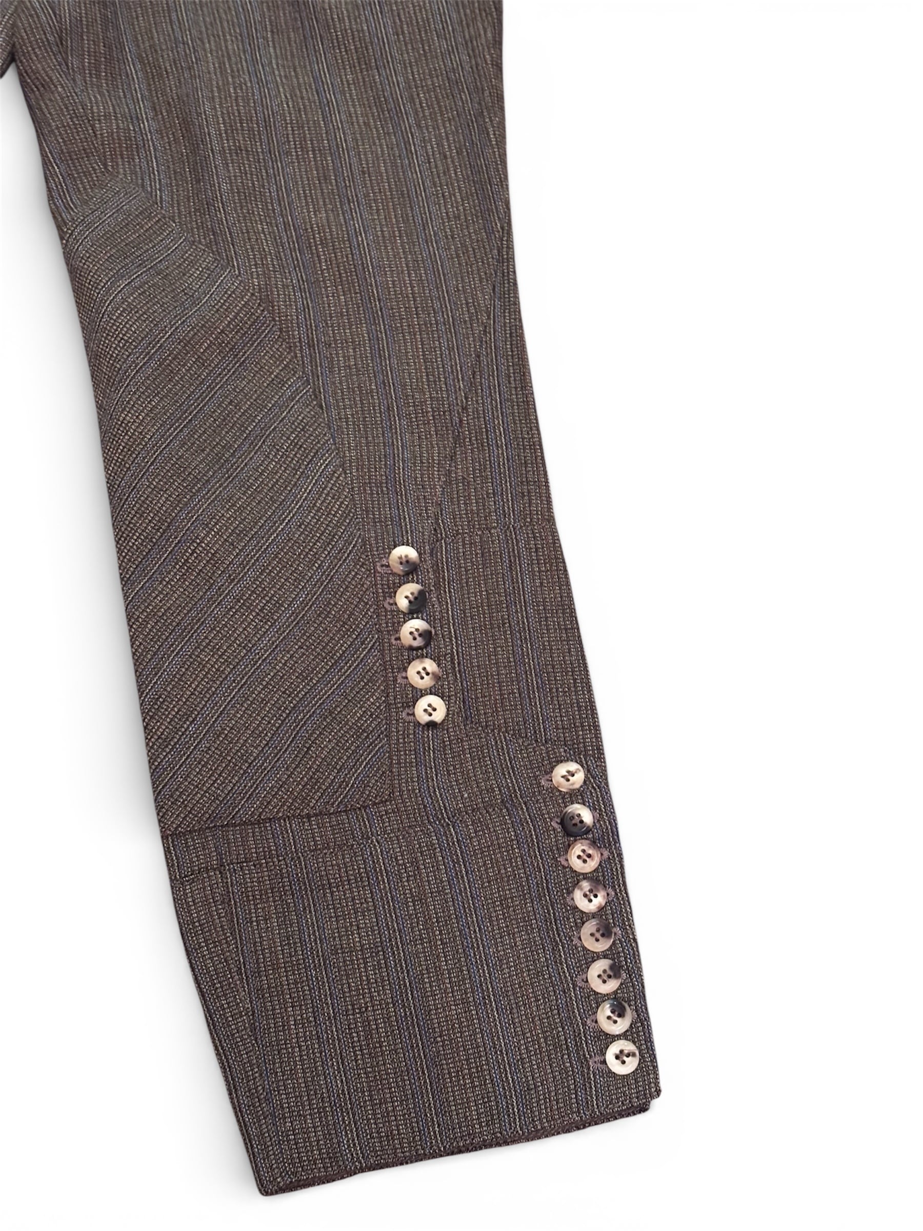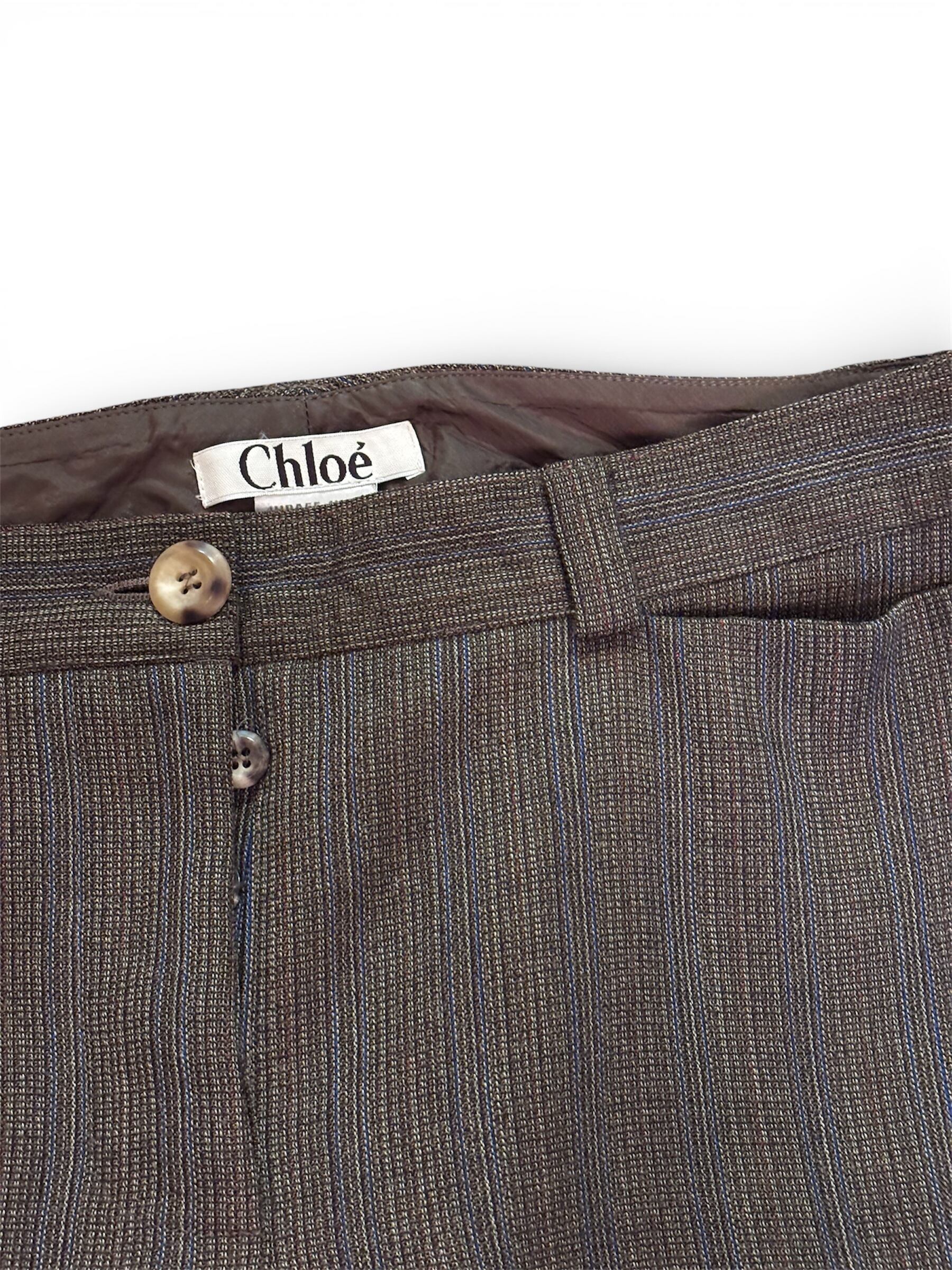 ダークグレーのストライプデザイン、サイドにボタン装飾が施されたChloéのカジュアルパンツ。